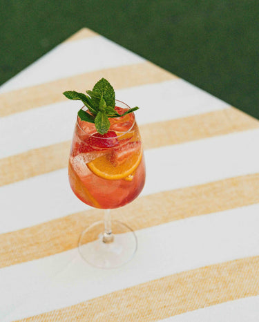 Dans un verre à vin, versez BTTR n°1, le sirop de fraise, puis JNPR n°3. Mélangez à l’aide d’une cuillère. Remplissez le verre de glaçons, puis ajoutez les feuilles de menthe, les demi-tranches d'orange, et les fraises coupées en deux. Complétez le verre avec l’eau gazeuse (ou de la limonade, selon votre préférence).